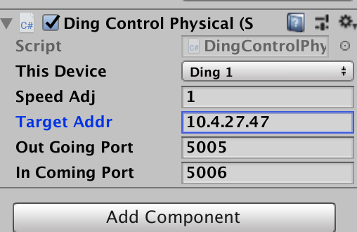 - Still in the inspector at the “Ding Control Physical” script, paste in the IP address of the robot where it says “Target Addr”