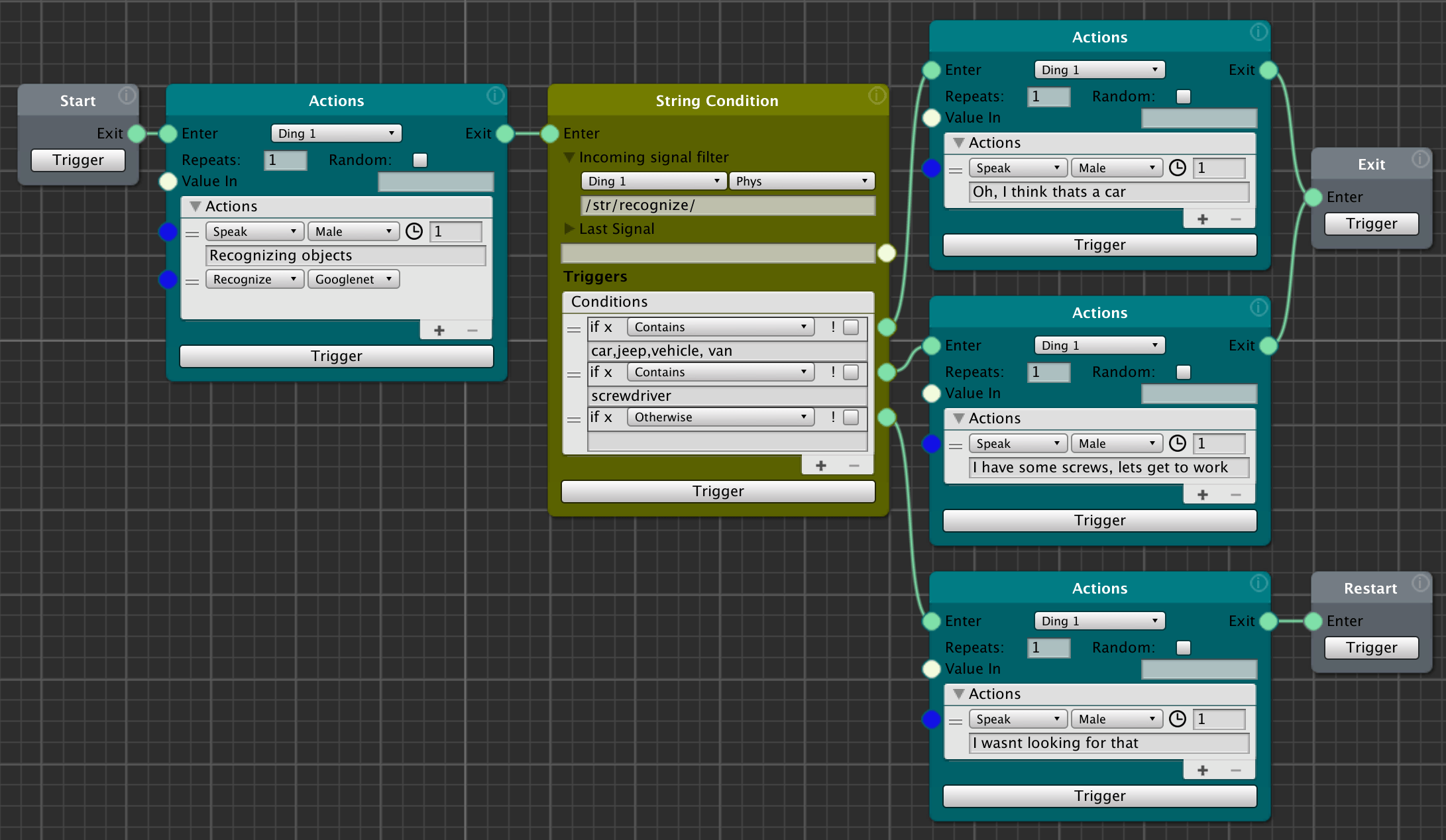 - Action Types - text2speech, speech2text, camera based object recognition, position servos, move wheels, leds