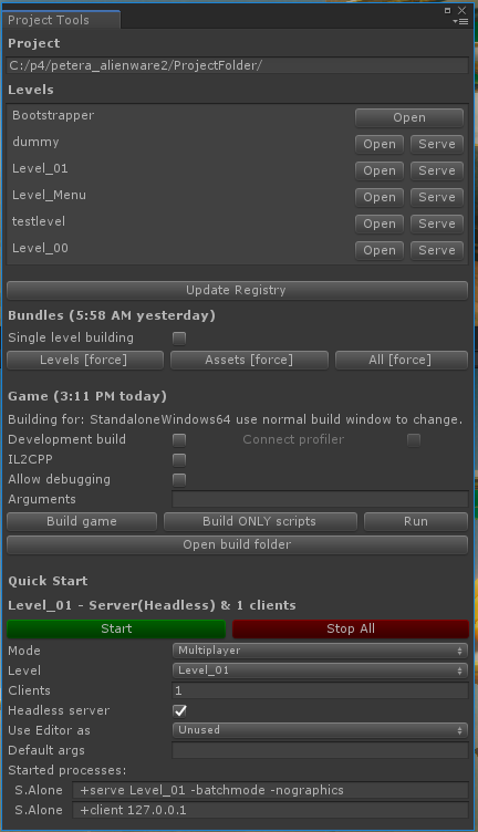 Keep this window docked as you will use it a lot. From here you can open the levels, build assetbundles and build standalone players. Because this is a multiplayer game you will need to work with standalone players a lot.
