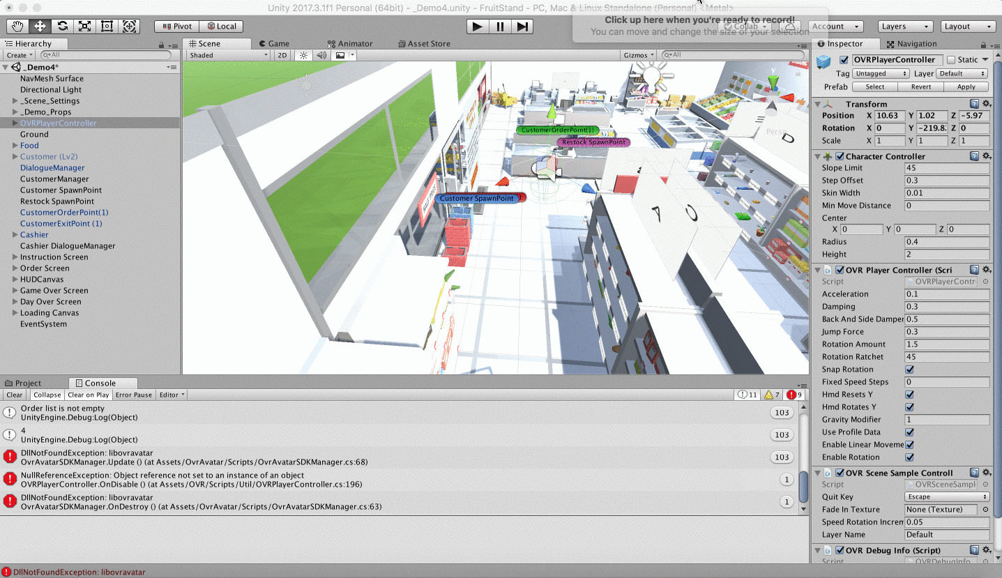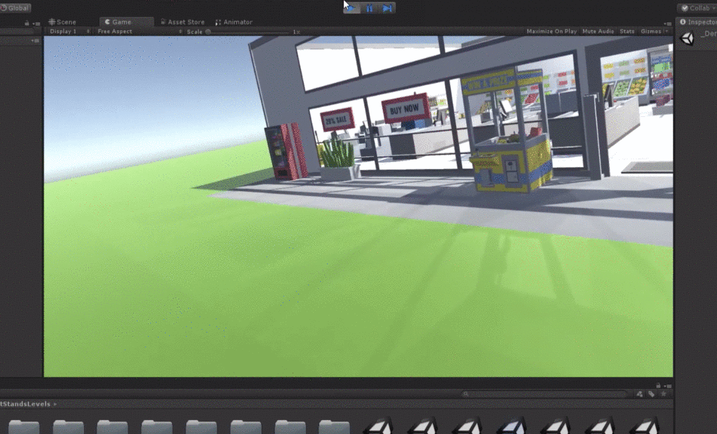 After you’ve downloaded and setup Unity and the Oculus Rift, you can download my FruitStand project from Github and add the desired assests to the assests folder of your newly created project. You may need to download some of the following Unity assets below to fully view my project: