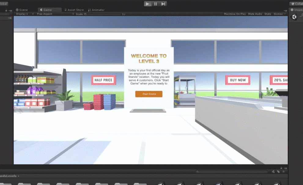 Look in the Assests > FruitStandsLevels folder, select any of the existing scenes, and hit the play button to start playing.